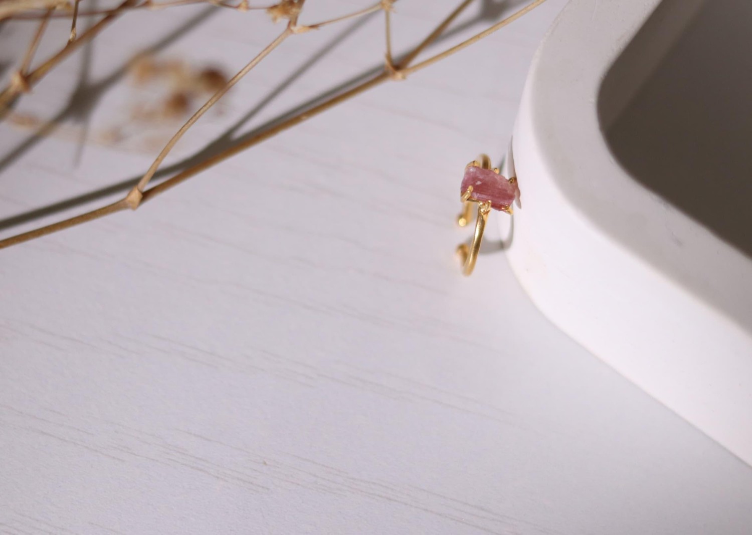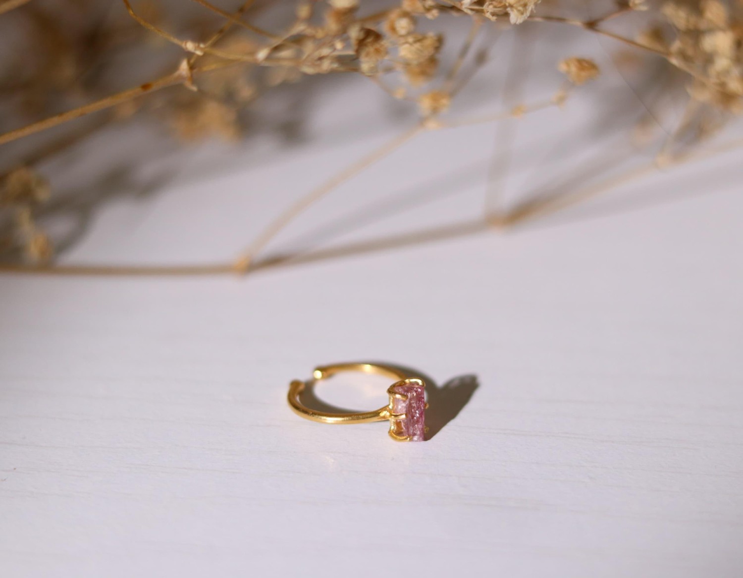 خاتم فضة نسائي بحجر التورمالين الوردي الخام (فري سايز)مطلي بالذهب